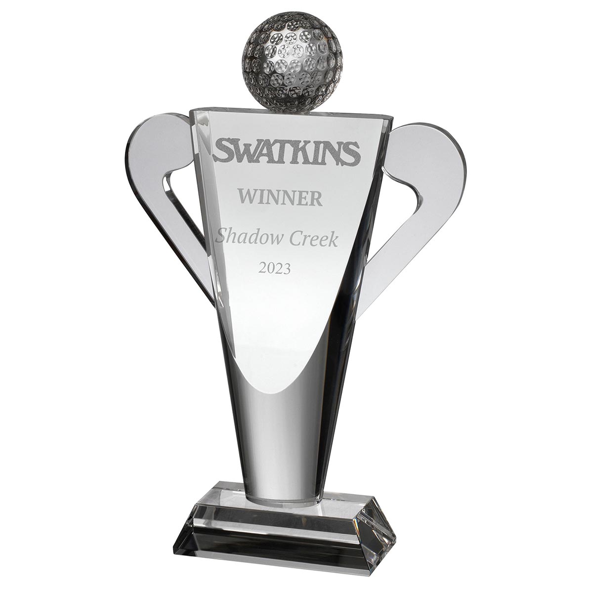 Crystal Trophy award 24cm highFeatures crystal golf ball sat atop a crystal trophyComes in a blue presentation boxEngraving plate can be applied to front or contact us for cost of glass engraving