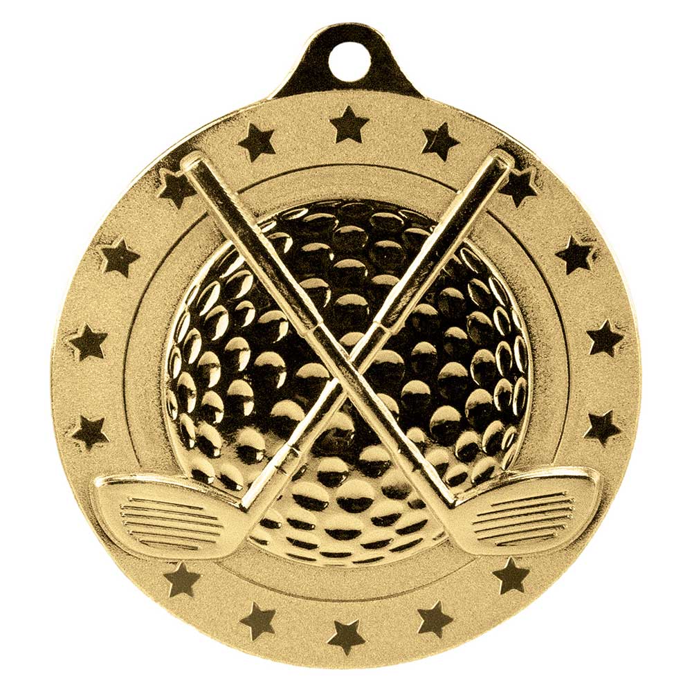 50mm diameter golf medal in goldFeatures golf club and ball design with ribbon loop