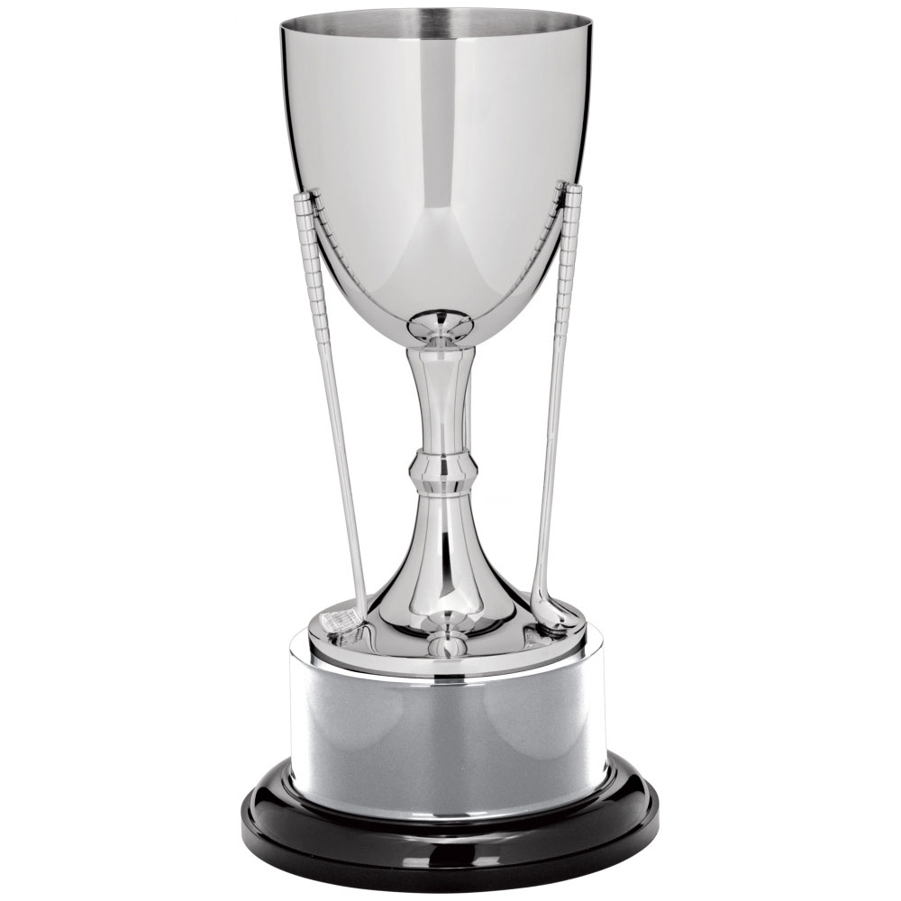 Nickel Plated Golf Cup 350mm high or 14 inchesLarge area for engraving a title or a logo on the cup.Decorated with iron, driver and putter with detailed gripsStands on a circular nickel plated cup plinth and wood base.