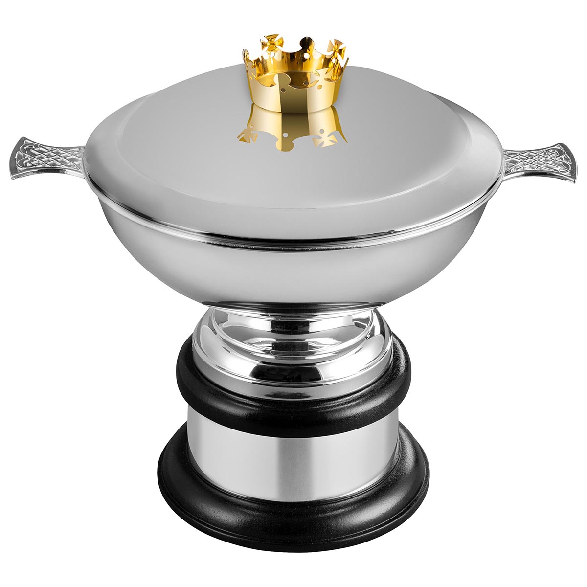 Hand made gold plated crown on the lid with large Quaich style handles.