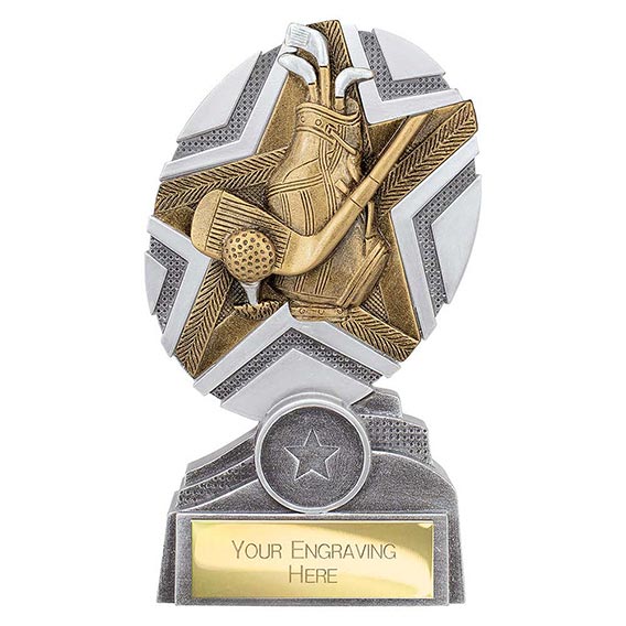 The Stars Golf trophy in silver and gold 170mm highFeatures gold golf bag, club and ball on tee with silver detailSits on an angled silver baseBadge and engraving plate can be applied to front
